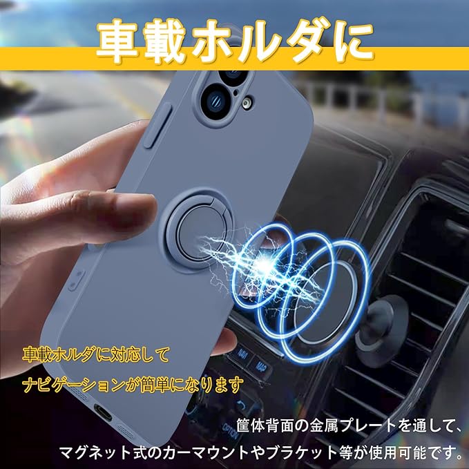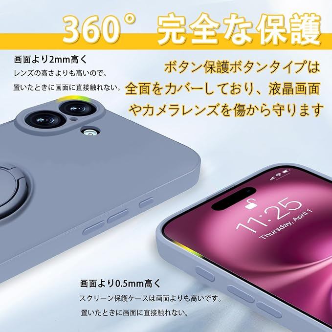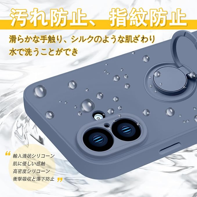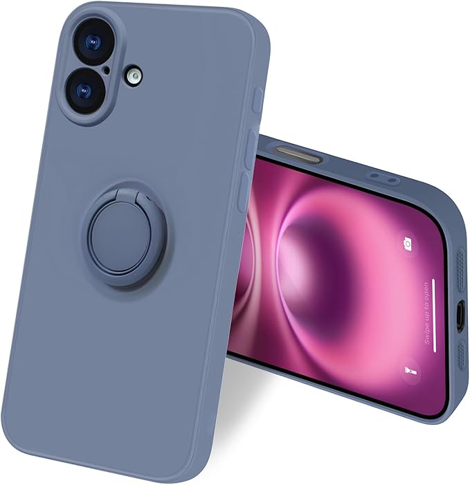 bjnosdv iPhone 16 Plus ケース リング付き シリコン 耐衝撃 アイフォン16 Plus リング カバー 360 回転 スタンド機能 リングの機能 車載ホルダー対応 レンズ保護 指紋防止 薄型 ストラップホール付き(グレーブルー)