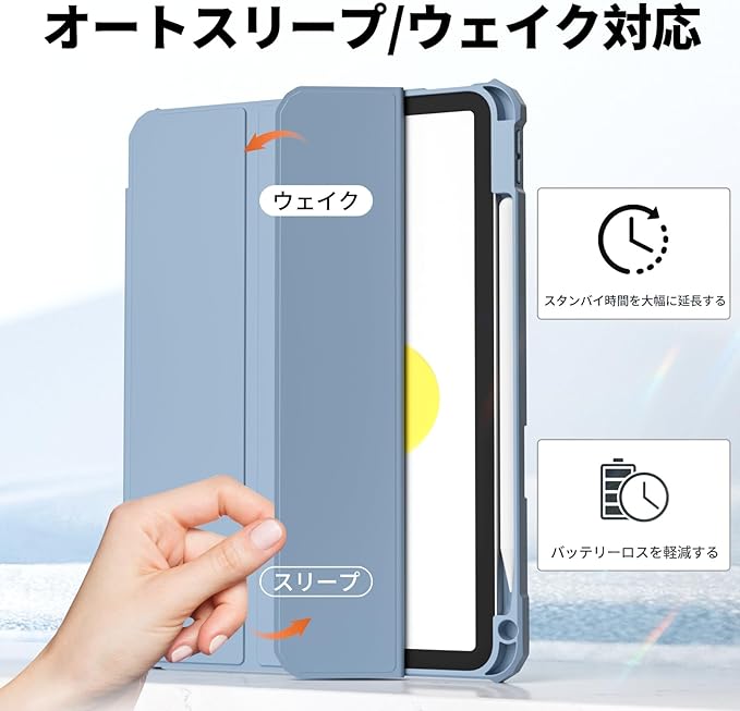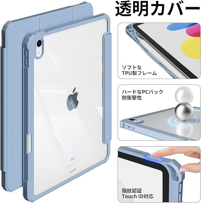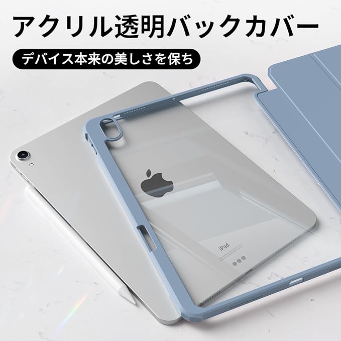 zoyu iPad 11世代 ケース A16 2025 /iPad 10世代 専用 ケース 2022 10.9 インチ ipad 第11/10世代 カバー アクリル クリア 透明バックカバー ペンシル収納 Pencil2収納可能 Touch ID 対応 自動ウェイク/スリープ 三つ折りスタンド薄型 軽量 耐衝撃 ソフトTPU A2696 A2757 A2777 ブルー