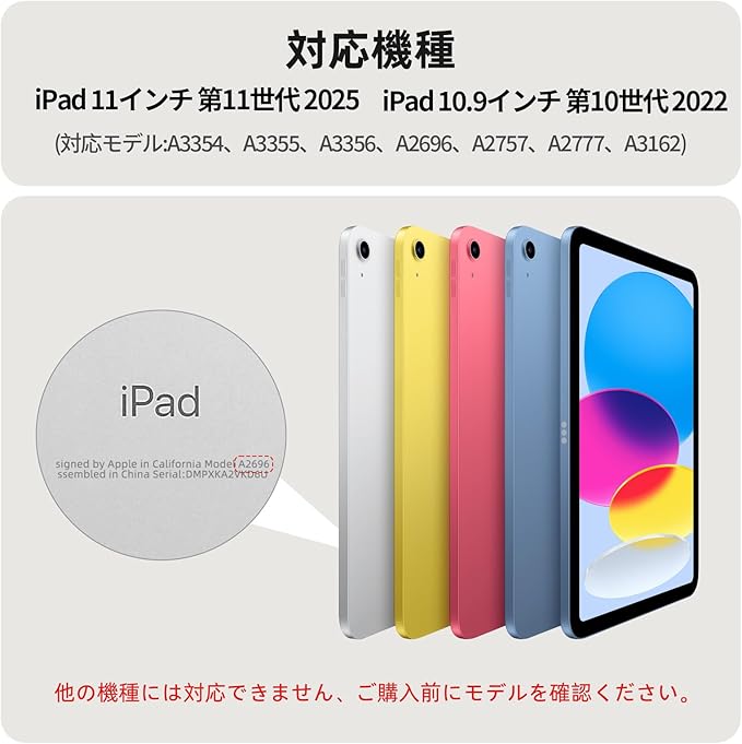 互換性: iPad第10世代(10.9インチ、2022モデル)用に設計されています。モデル:A2757/A2777/A2696。 注意: モデル番号を確認するには、iPadの背面下部を確認してください。