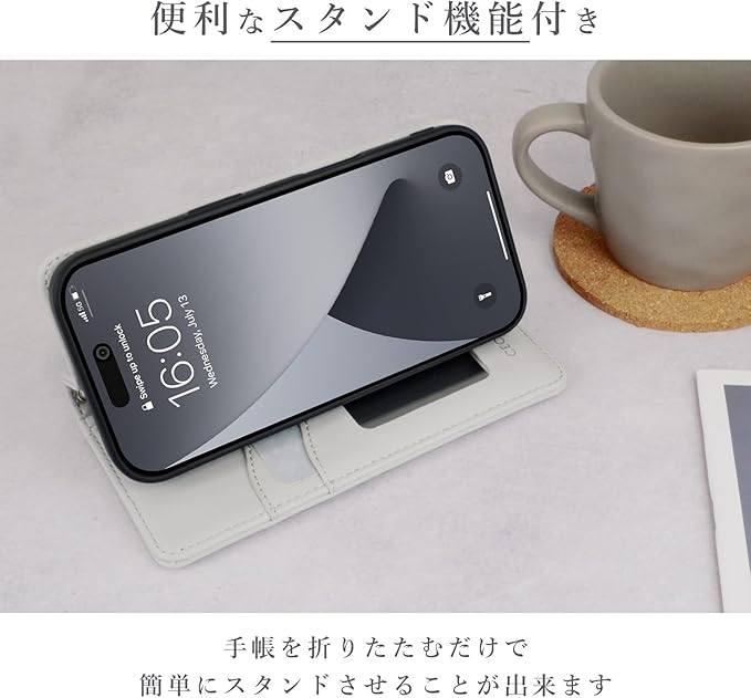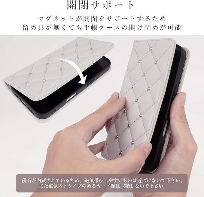 【特徴】 ・ふっくらしたキルティング ・開閉サポート付き ・カード収納付き×2ケ ・サイドポケット付き ・大きなミラー付き ・内部ケースはTPU ・ストラップホール付き