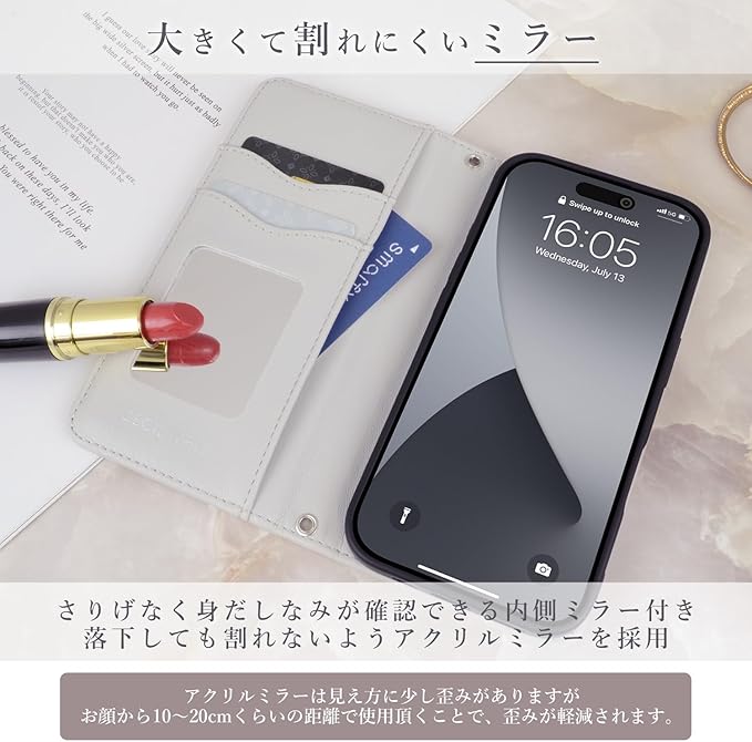 【大きなミラー付き】ちょっとした身だしなみチェックに使えるミラー付き。万一の飛散防止のためアクリル製のミラーを使用しており、割れにくく丈夫なミラーです。※アクリルミラーを使用しているため見え方に若干の歪みが発生します。お顔から10〜20cmの近さで使用頂くことでミラーの歪みが軽減致します。