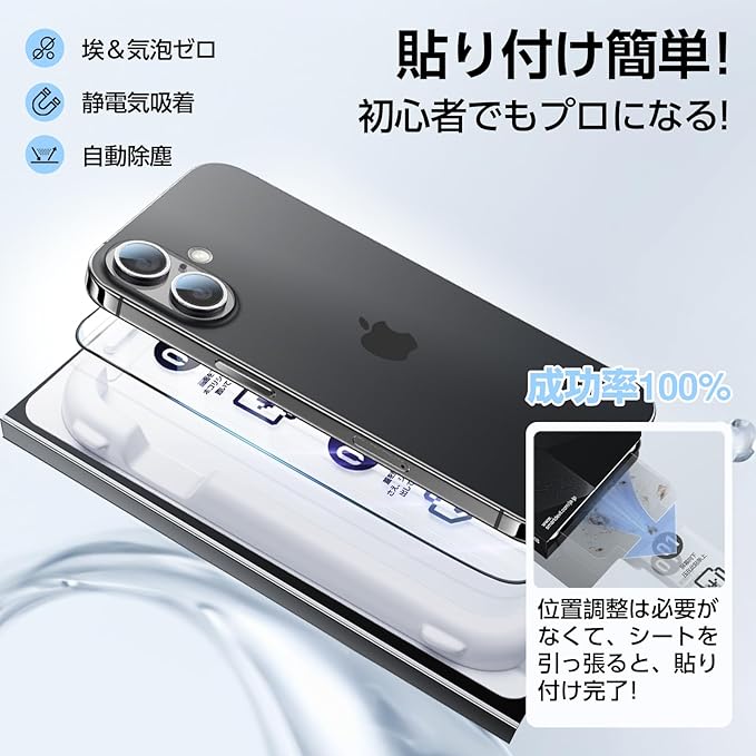 【対応機種】 iPhone 16 専用 強化ガラスフィルム 一体型ガイド枠付き。