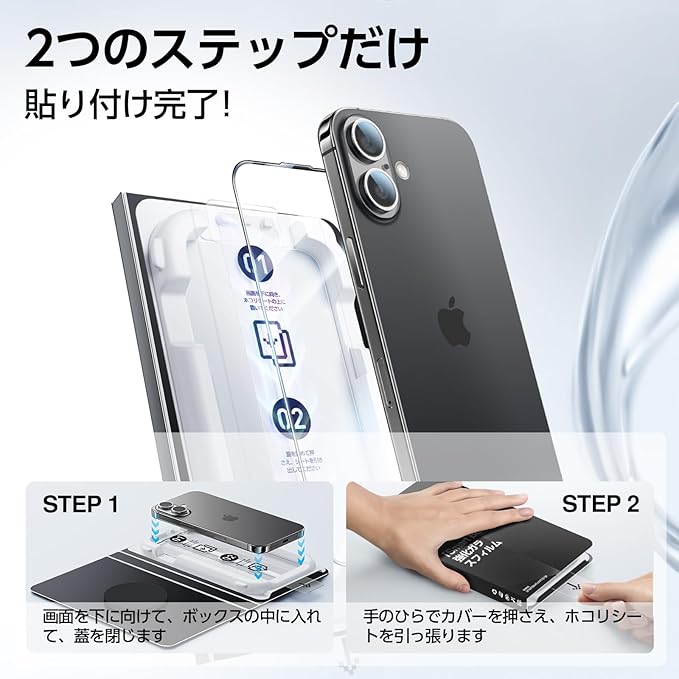 【新しい貼り付け体験】専用ボックスの中にスマホを入れて、シートを引くだけで簡単に貼り付け可能です。