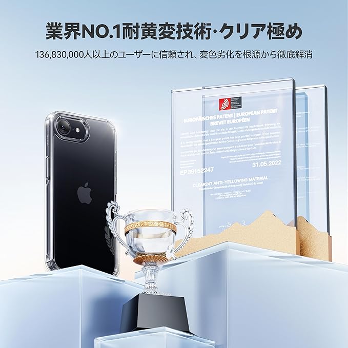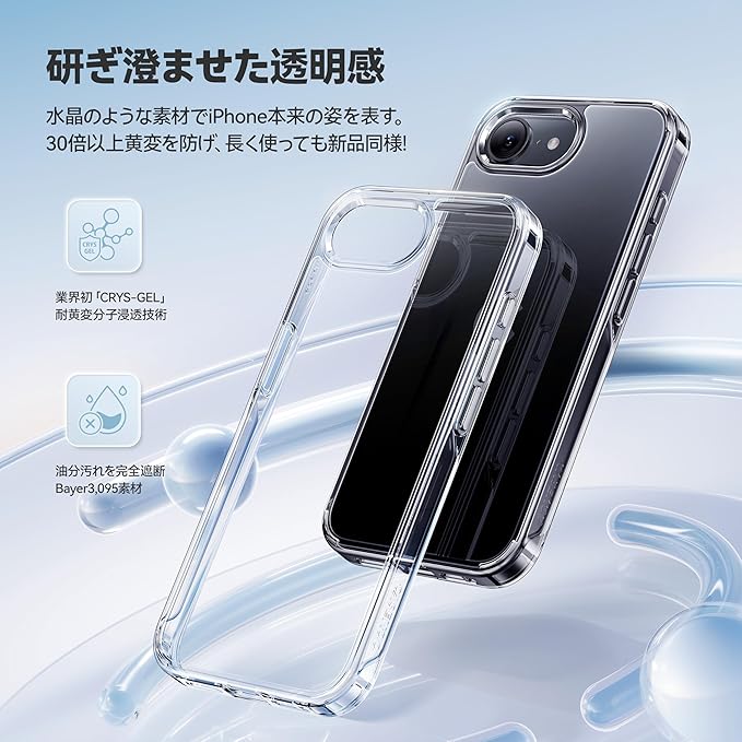 【究極の美しさ・99.99%の透明感】高透明度ダイヤPC素材を採用し、スマホ本来の美しさをそのまま引き立てます。特許取得の「CRYS-GEL」技術でケース内部に分子が浸透し、変色や劣化を徹底的に防止。180日間続く驚異的な透明感で、透明度と高級感を存分に楽しめます。抗UV性LCS認証番号:LCS210425017AR200|認証機関:LCS Compliance Testing Laboratory|認証時間:May 08, 2024 対応機種:iphone 16e ケース