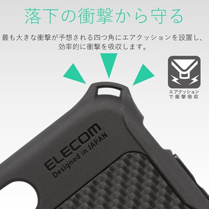 【握りやすさ】ケース背面から側面にかけてカーボン調のグリップテクスチャを施すことで、滑りにくくし持ちやすさを向上しています。