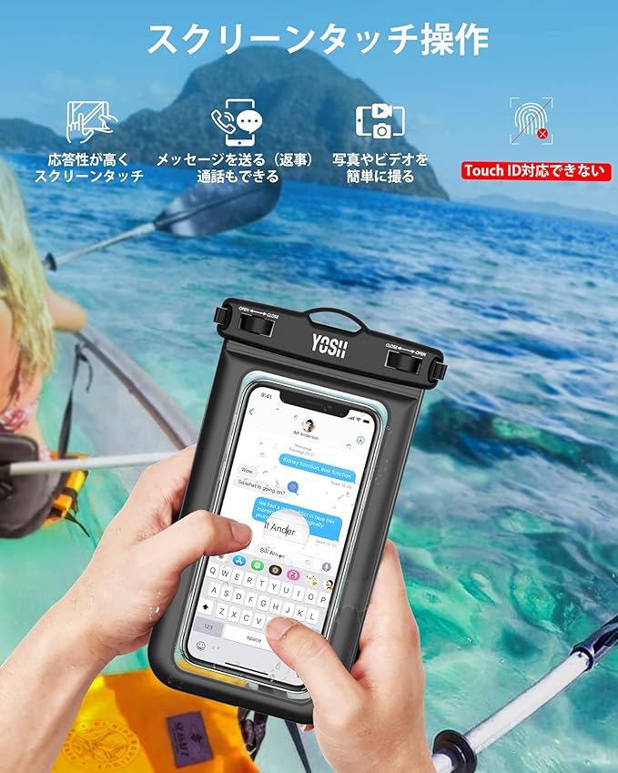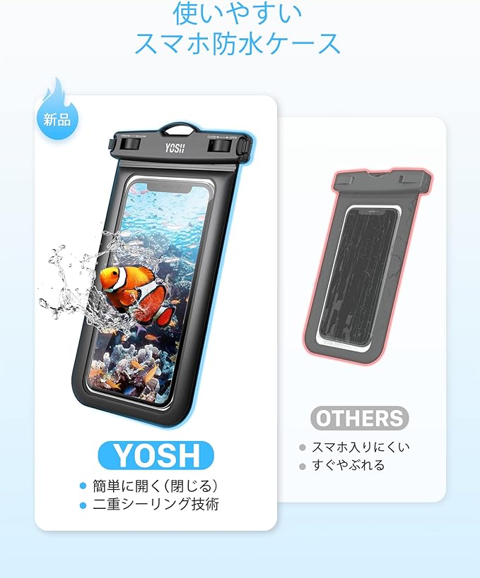 ?IPX8防水?気密性を高めるために、YOSHスマホ 防水ケースの枠は4層構造で防水効果を向上させました。防水国際保護等級IPX8認定を獲得、 水深約30mの環境でも30分間の防水が可能です。また、水・雪・砂・汚れもの・擦り傷からスマホを保護することができます。(ご注意:ご使用の前に必ず一枚の紙をケースに入れて、防水ケースは水没して30分間の防水試験を行ってください。)