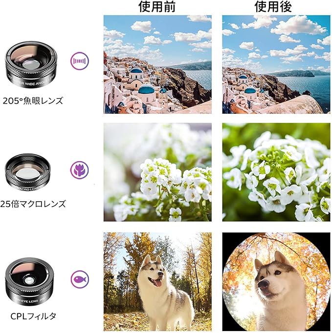 【多機能レンズ】:この携帯カメラのレンズセットを使って創造力と楽しみを十分に発揮できます。205°魚眼レンズは面白い独特な円形神秘効果画像を創造でき、独特な視角を提供し、視野範囲も広角レンズとして作用することができる。広角レンズは風景を撮ってもいいし、集合写真も撮ってもいいです。マイクロミラーは花や昆虫などの小さな物体の写真を撮ってもいいです。CPLミラーは反射光