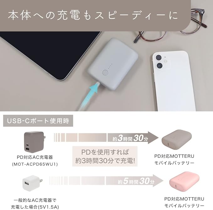 MOTTERU(モッテル) モバイルバッテリー 大容量 10,000mAh 174g PD18W入出力 PSE認証 iPhone16e 16 15 iPad Galaxy Android スマートフォン タブレット 各種機器対応 エアリーホワイト MOT-MB10001-WH