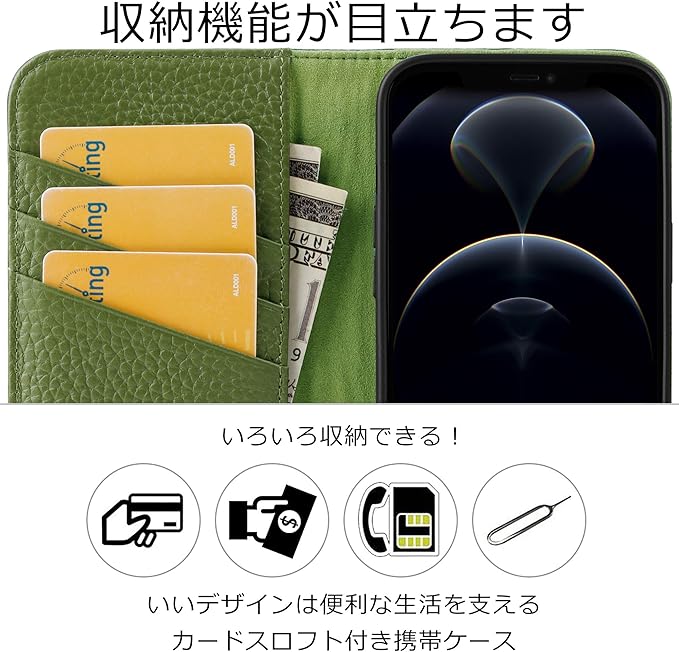 VISOUL iPhone12 ケース 手帳型 本革 スマホケース iPhone 12 Pro レザーケース 耐衝撃 耐汚れ カード入れ 携帯ケース マグネット 横置き ブック型 アイフォン 12Pro/12対応 6.1インチ シュリンクレザー iphone 12Pro グリーン