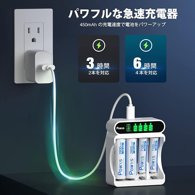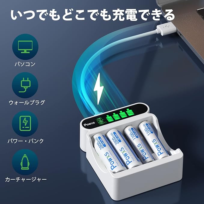 POWXS 電池充電器 単3単4電池 4本同時充電 LCDディスプレイ ニッケル水素/ニカド 単三充電池/単四充電池に対応できる 急速電池充電器 USB&Type-c 単3/単4充電器
