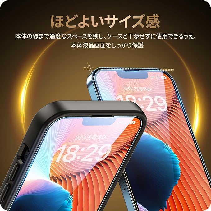 iPhone本体の縁まで適度なスペースを残すデザインとなっており、フィルムの剥がれや浮き上がりを防止し、スマホケースと干渉せずに快適に使えます。