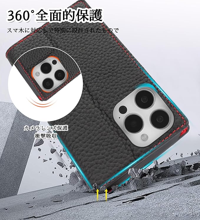 CLICSUN iPhone13 ProMax 対応ケース 高級牛本革ケース 手帳型 iPhone13 ProMaxカバー 本革 レザー アイフォン13 ProMax 対応カバー スタンド機能 ストラップ付き マグネット式 カードポケット ギフトボックス付き ブラック