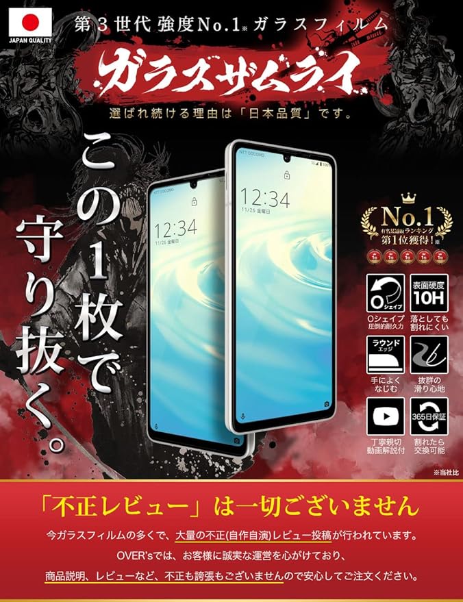 OVER's ガラスザムライ AQUOS Sense6 用 ガラスフィルム SH-54B 用 SHG05 用 SH-M19用 AQUOS Sense6s 用全面保護 黒縁 硬度10H らくらくクリップ付き 338-3d