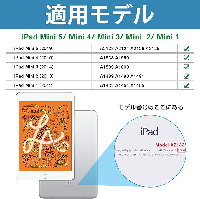 ?【対応端末】Apple iPad Mini 5 7.9" 2019 (A2133 A2124 A2126 A2125), iPad mini 4(A1538 A1550 A1546), iPad Mini (2012), Mini 2 (2013), Mini 3 (2014) (A1432 A1454 A1455 A1489 A1490 A1491 A1599 A1600);その他の型式に適用されません。購入前、ご設備のモデル番号をご確認いただきます。