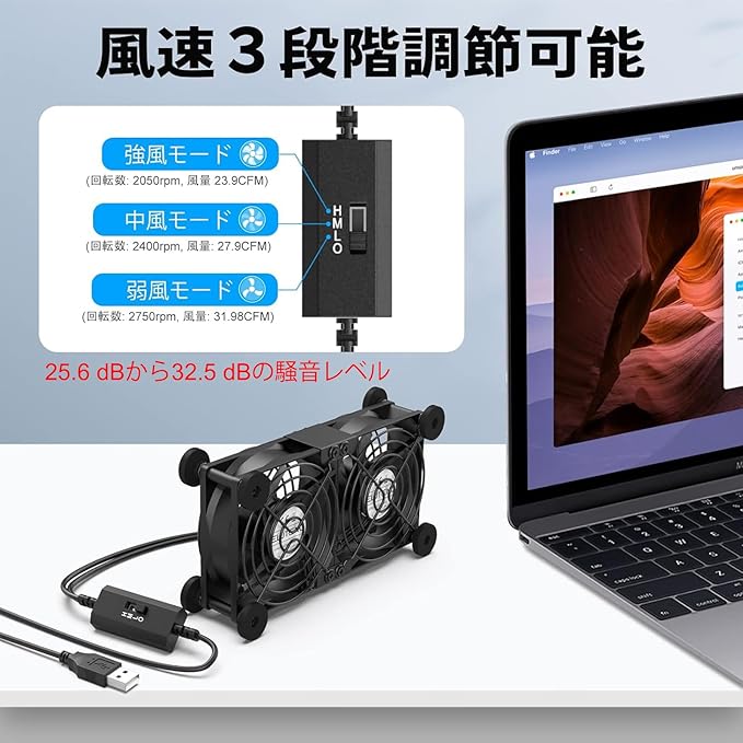 【3段階風速調節可能】パソコン ファンは面倒な配線が無く、USBインターフェースを採用して、プラグを差し込んで使用できます。風速調整スイッチを備えて、風量は3段階で調節可能。使用環境や用途に応じて、風量を選択できます。軽量・コンパクトで