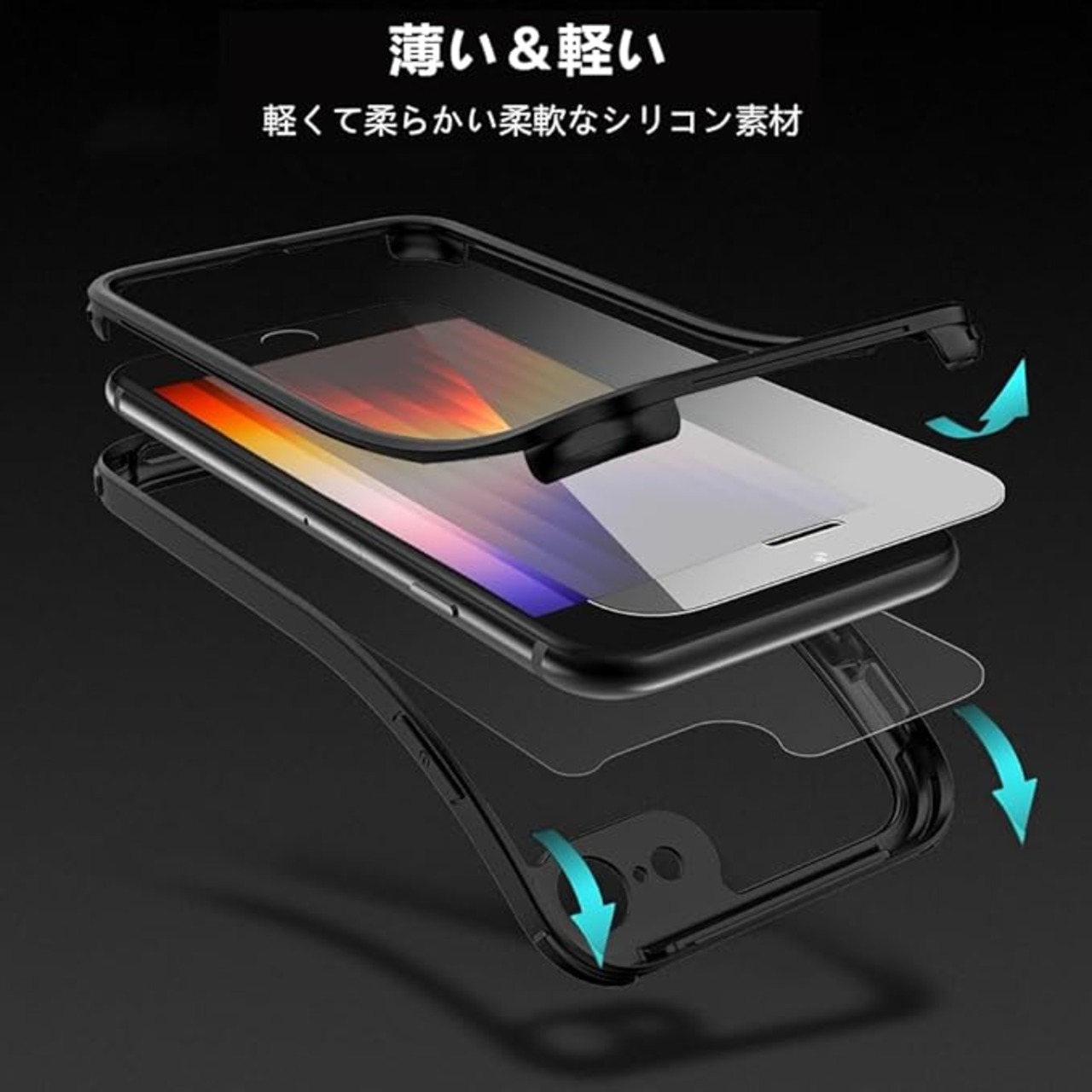 【完全的に全面保護】:マグネット式と違い、角の部分には爪による、両面パーツをしっかりと固定され、高場所から落として、ケースは分離しません。外側のフレームは柔軟なシリコン素材で、落下時に衝撃が吸収できます。また、背面は透明な9H強化ガラスのプレートで、アイフォンの背面デザインも綺麗に確認できます。