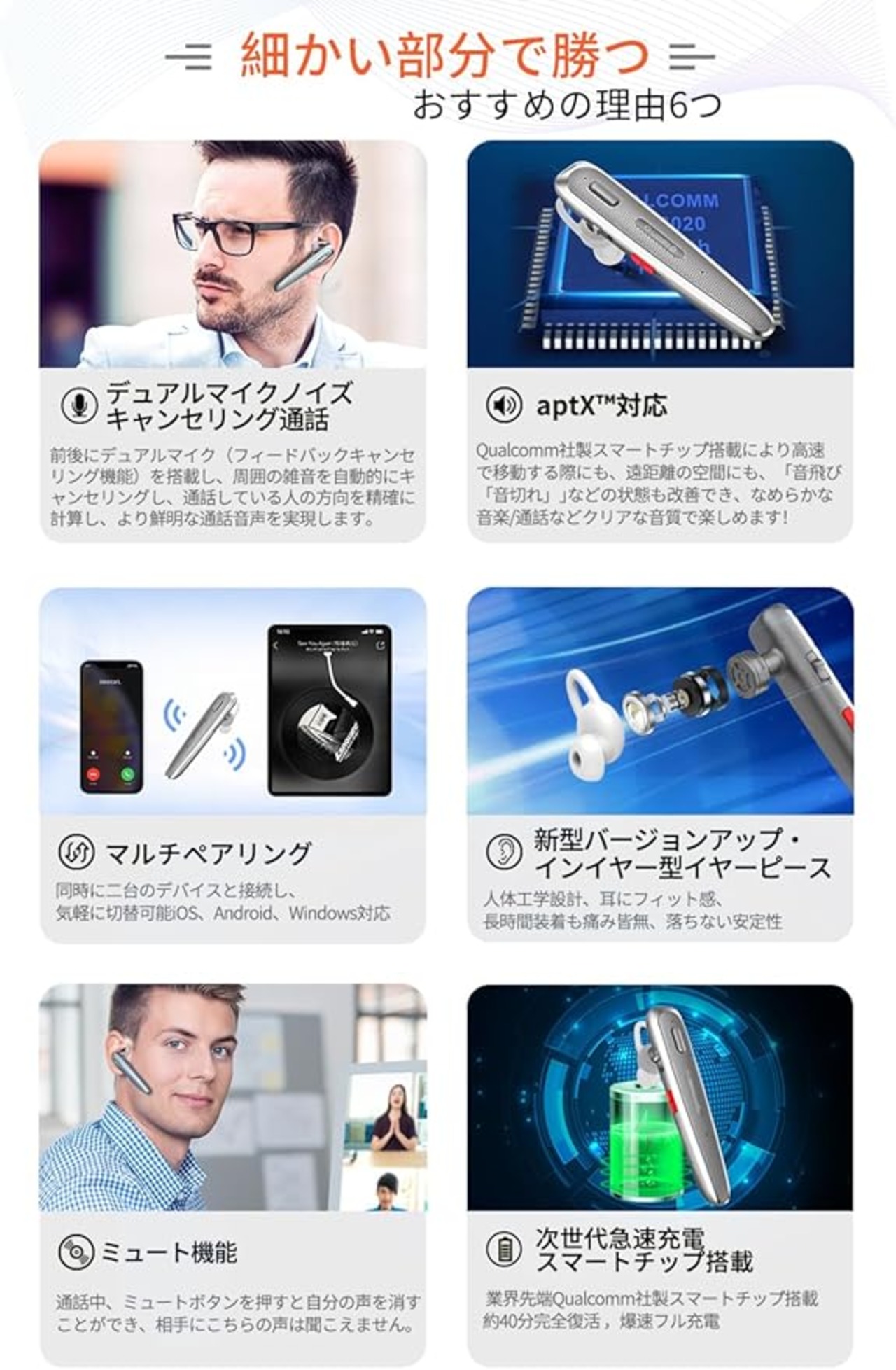 ?【aptX & aptX HD、SBC・AAC対応】業界最先端Qualcomm社製スマートチップ搭載により、AAC 、aptX 2つのコーデックどちらにも対応可能。従来のSBCコーデックと比較して、Qualcomm aptXは再生時の遅延を強力に抑え、全く新しいデュアルマイクのアクティブノイズキャンセリング機能で通話の騒音と周囲の騒音をシャットアウト、さらに、通話の騒音と周囲の騒音をシャットアウト、対面会話のように鮮明な通話を実現します。ご使用の携帯電話がAPTX対応であることが必要です。