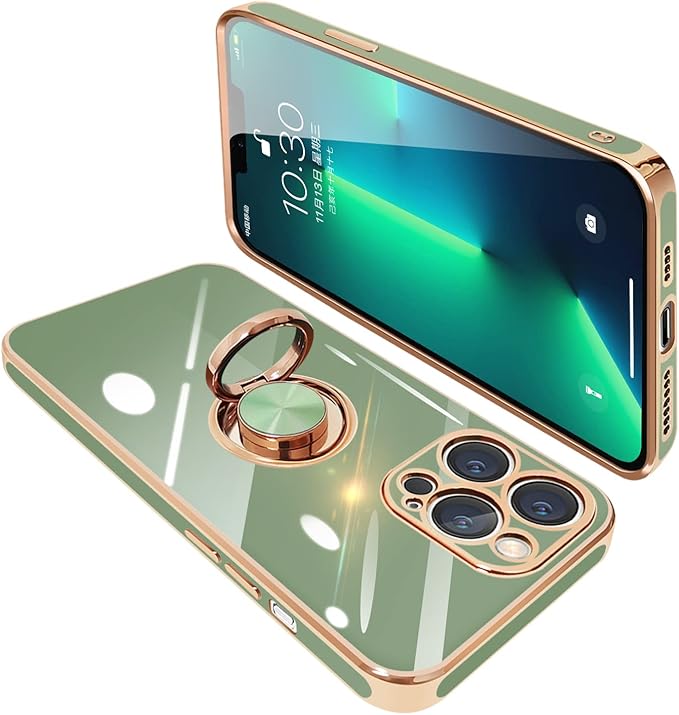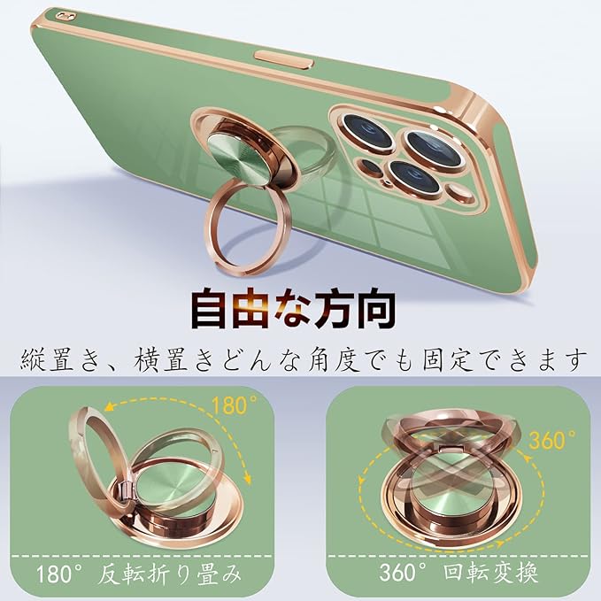 iPhone13 Pro Max ケース リング付き アイフォン13promax リング カバー 耐衝撃 TPU メッキ加工 360 回転 スタンド機能 車載ホルダー ストラップホール付き 6.7インチ(グリーン)