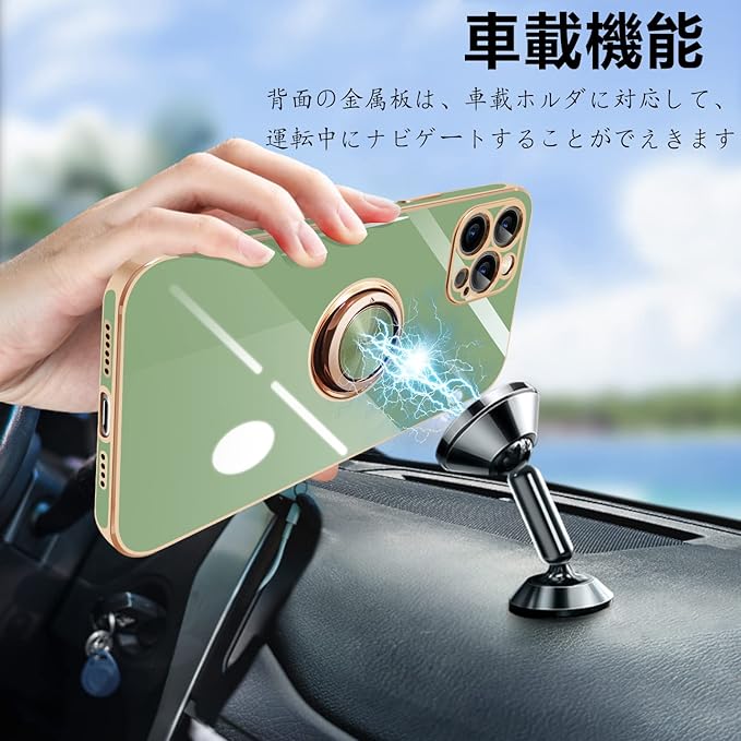 iPhone13 Pro Max ケース リング付き アイフォン13promax リング カバー 耐衝撃 TPU メッキ加工 360°回転 スタンド機能 車載ホルダー ストラップホール付き 6.7インチ(グリーン)