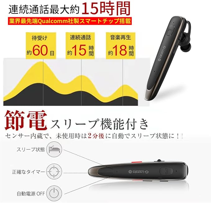 Glazata 日本語音声ワイヤレスヘッドセット Bluetoothイヤホン Qualcomm社製スマートチップ搭載【aptX & aptX HD、SBC・AAC対応 デュアルマイク通話設計 ENCノイズ低減技術 ミュート/SIRI搭載 】 次世