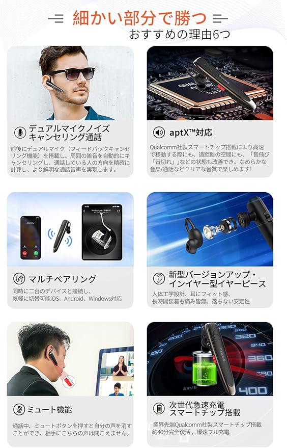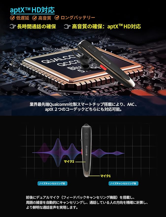 ?【デュアルマイク高音質通話設計】ご注意:本商品使用上のアドバイスとしては、完全防水ではないため、土砂降りの雨天でのご使用や長時間水に浸かることはお避け下さい。また、服やズボンを洗濯機に入れる際には、必ず本商品を取り出して下さい。前後にデュアルマイク(フィードバックキャンセリング機能)搭載により、周囲の雑音を自動的にキャンセリングし、通話している人の方向を精確に計算し、より鮮明な通話音声を実現