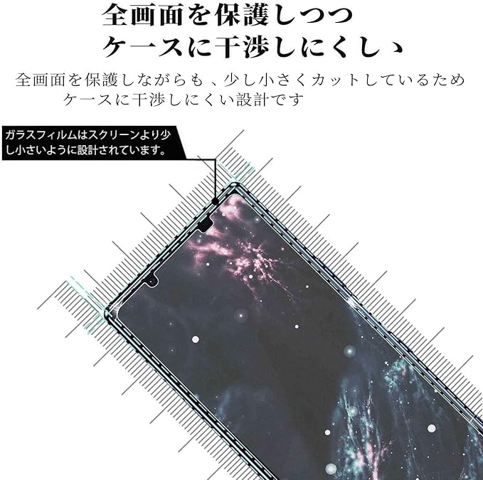 『対応機種』Xperia5 II(SOG02 SO-52A)専用。携帯は端部のカーブがフィルム剥がれ、浮きの防止、スマホケース装着スペース確保のため、機器の曲面の縁にスペースを残すデザインとなっています。