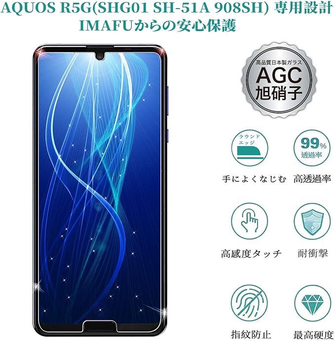 【端が浮かない/2枚入り】 AQUOS R5G ガラスフィルム SHG01 SH-51A 908SH 強化ガラス 保護フィルム 【指紋防止/高透過率/気泡ゼロ/干渉しない/貼り付け簡単/9H】