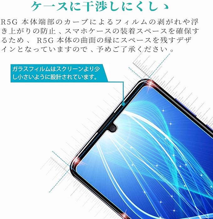 『 対応機種 』AQUOS R5G(SHG01 SH-51A 908SH) に適応しています。携帯は端部のカーブがフィルム剥がれ、浮きの防止、スマホケース装着スペース確保のため、機器の曲面の縁にスペースを残すデザインとなっています。