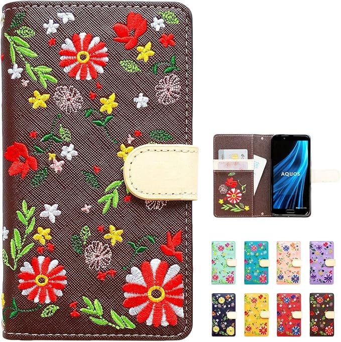 AQUOS R7 SH-52C A202SH 手帳型 ケース カバー SH52C SH-52Cケース SH-52Cカバー A202SHケース A202SHカバー SH52Cケース SH52Cカバー AQUOSR7 手帳ケース 手帳型ケース スマホケース ヌメ花刺繍 ブラウン