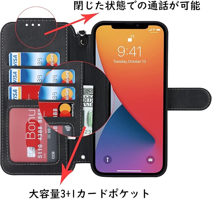 Havaya iPhone 13Pro ケース iPhone13Pro ケース iphone 13 Pro ケース 米軍MIL規格 軽薄 手帳型 ストラップ 耐衝撃 レンズ保護 (アイフォン13プロ/あいふぉん13Pro/いphone13Pro/アイホン13プロ 6.1インチ対応)-ブラック