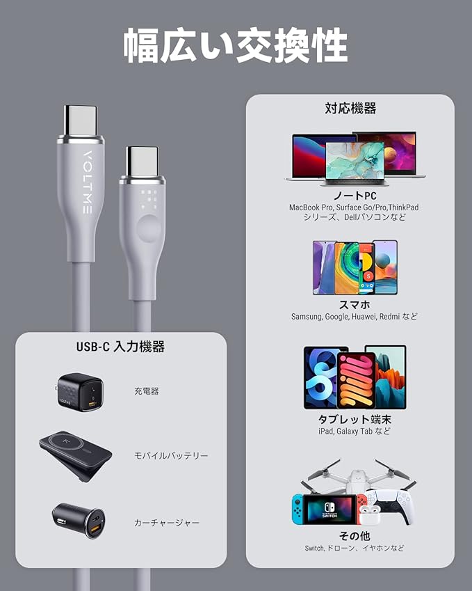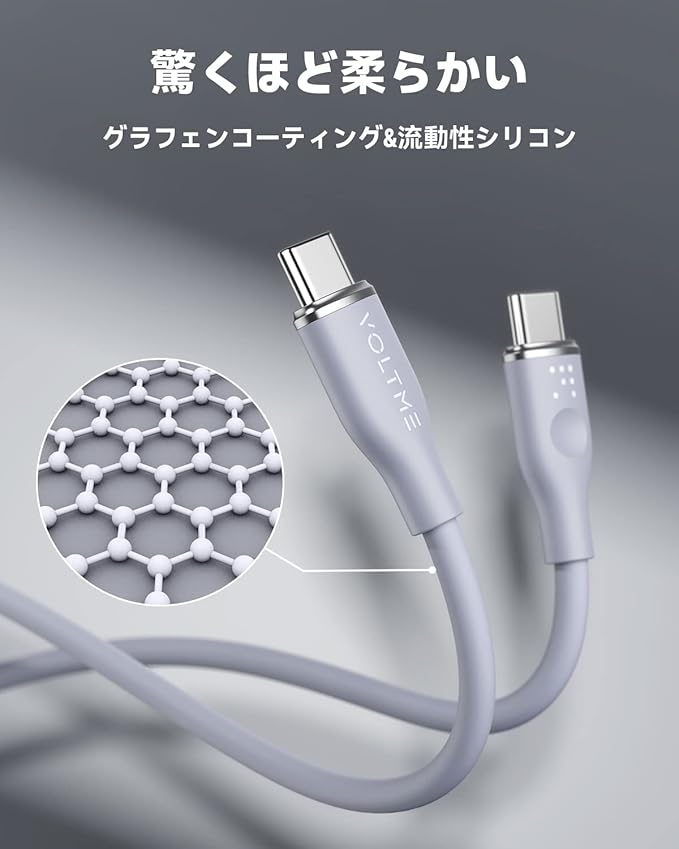 USB Type C ケーブル VOLTME 100W PD対応 急速充電 超高耐久 usb ケーブル シリコン素材採用 絡まない 断線防止 iPhone 16/15、Macbook Pro/Air iPad ノートパソコン Galaxy Google Pixel Android(アンドロイド) 各種対応 USB-C & USB-C ケーブル(1.8m グレー)