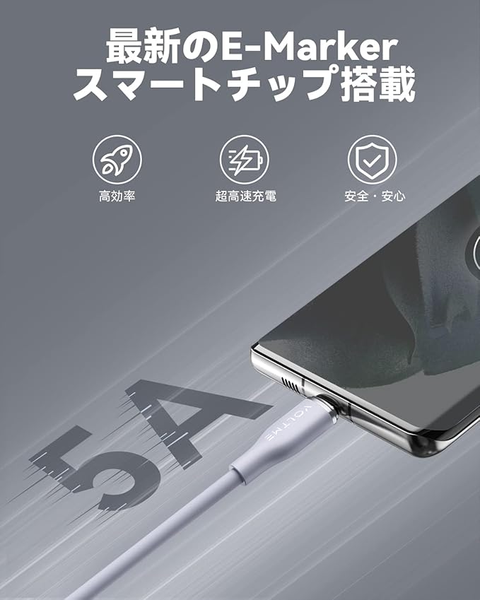 【最大100Wの超高速充電対応】USB PD(Power-Delivery)対応するVOLTME usbケーブルは、最大出力100Wの高出力で、スマートフォン、タブレット端末、ノートPC等のUSB-C端子機器にフルスピード充電が可能です。