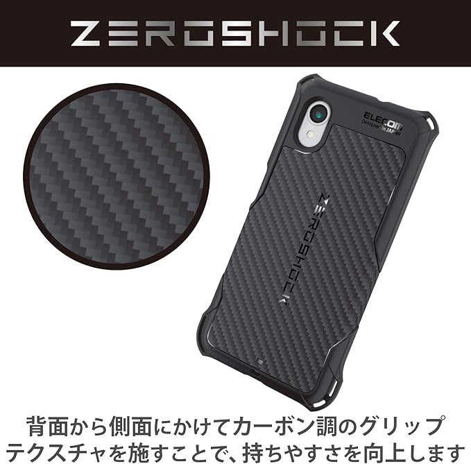 ケース背面から側面にかけてカーボン調のグリップテクスチャを施すことで、滑りにくくし持ちやすさを向上しています。