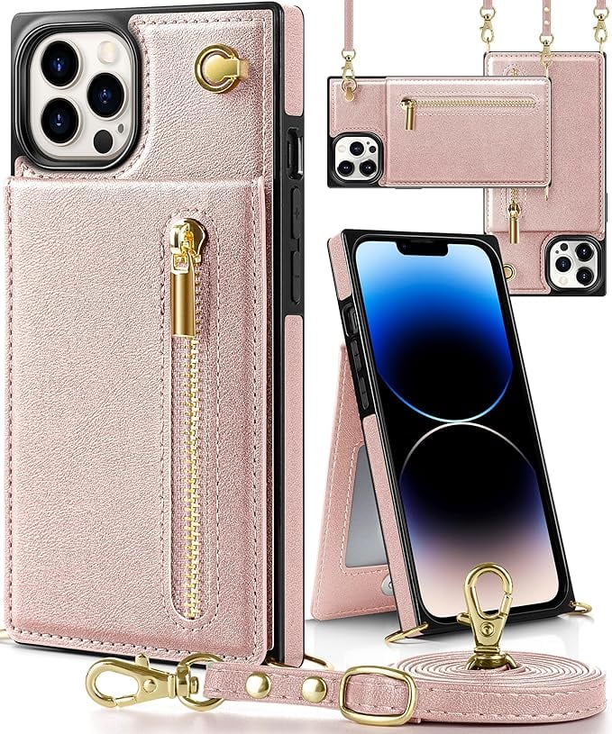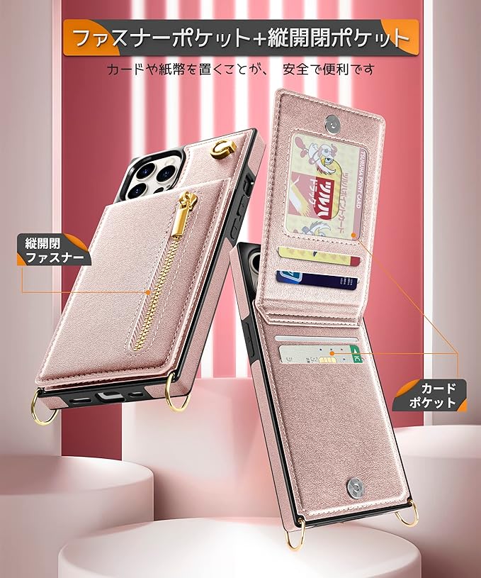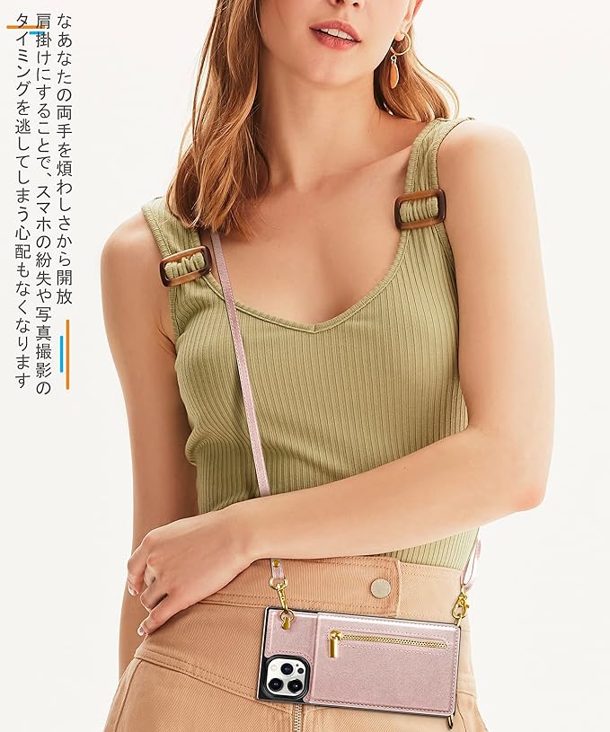 YIHARA iphone 14 Pro ケース手帳型 iphone 14 Pro スマホ ケース 財布型 iPhone 14 Pro 適用 携帯ケース 肩掛け 首かけ 斜めがけ ショルダー アイフォン14 Proケース手帳型 背面 カード収納 ストラップ付き 上下開 長さ調整可能 ピンク