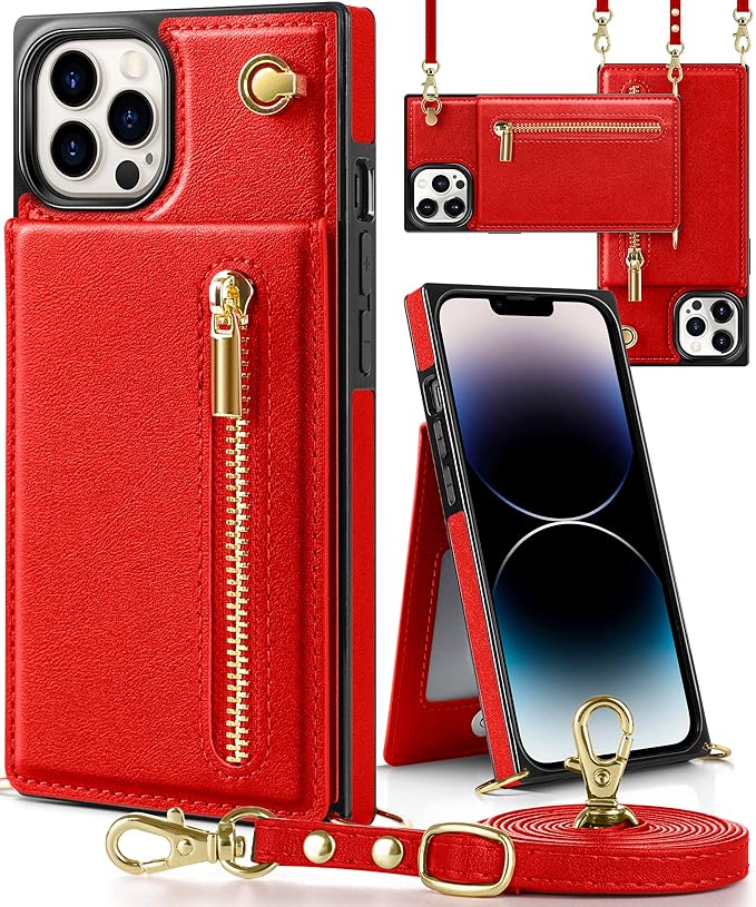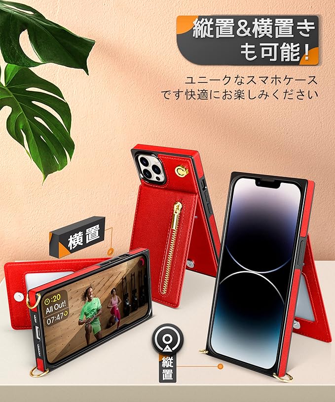 YIHARA iphone 14 Pro ケース手帳型 iphone 14 Pro スマホ ケース 財布型 iPhone 14 Pro 適用 携帯ケース 肩掛け 首かけ 斜めがけ ショルダー アイフォン14 Proケース手帳型 背面 カード収納 ストラップ付き 上下開 長さ調整可能 レッド