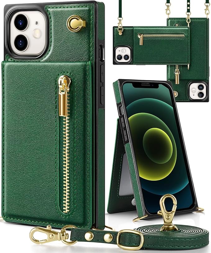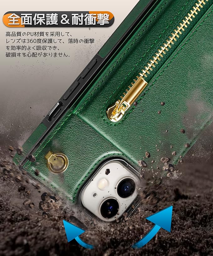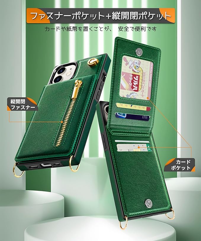 YIHARA iphone 12 mini ケース手帳型 iphone 12 mini スマホ ケース 財布型 iPhone 12 mini 適用 携帯ケース 肩掛け 首かけ 斜めがけ ショルダー アイフォン 12 mini ケース手帳型 背面 カード収納 ストラップ付き 上下開 長さ調整可能 グリーン