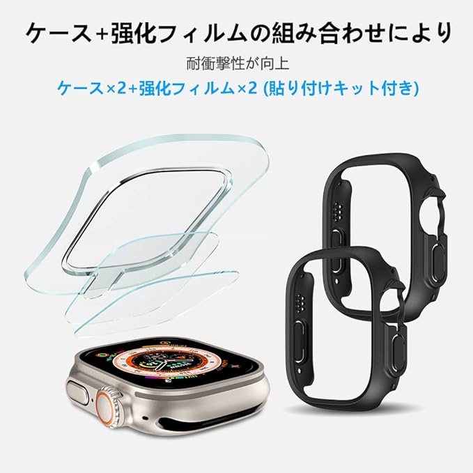 【対応機種&パッケージ規格】:Apple Watch Ultra2/Ultra 49mmに対応します。PC製ケース*2、強化ガラスフィルム*2(貼り付けガイド付き)