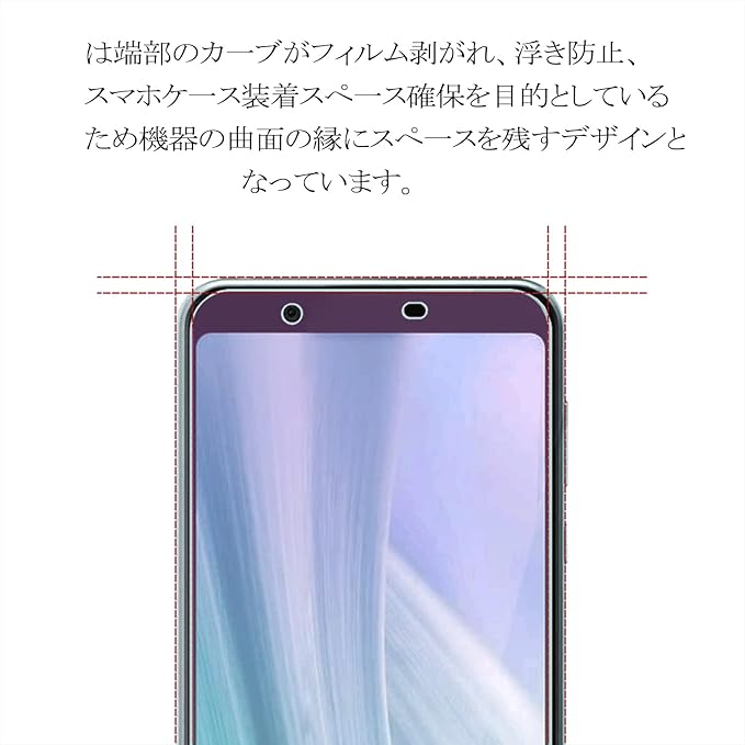 『 対応機種 』AQUOS Sense3 plus(SHV46 SH-RM11)に適応しています。携帯は端部のカーブがフィルム剥がれ、浮きの防止、スマホケース装着スペース確保のため、機器の曲面の縁にスペースを残すデザインとなっています。