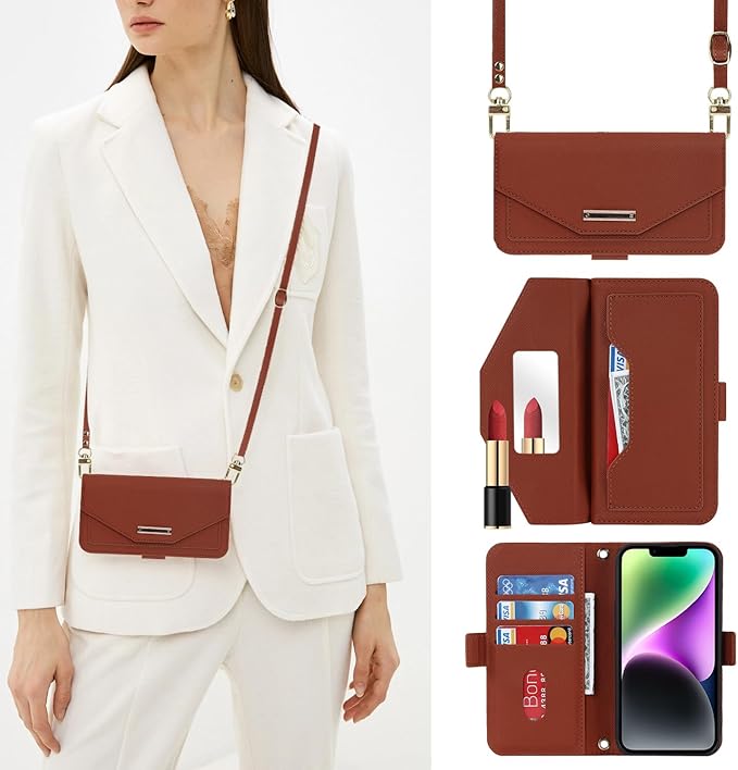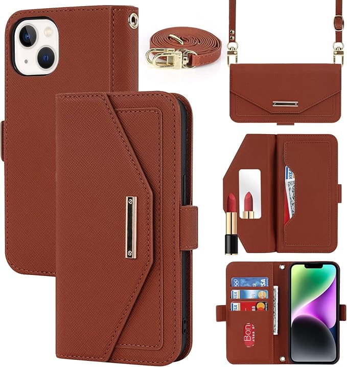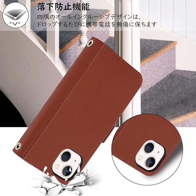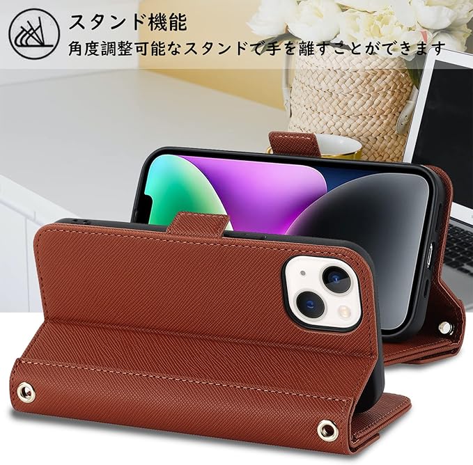 【Hamany】 いphone14 ケース 手帳型 ショルダー 鏡 スマホケース iphone 14 ストラップ付き ミラー カード収納 財布 iphone 14 ケース クロスボディケース 肩がけ 首掛け 斜め掛け 耐衝撃 レザー アイホン14ケース -茶褐