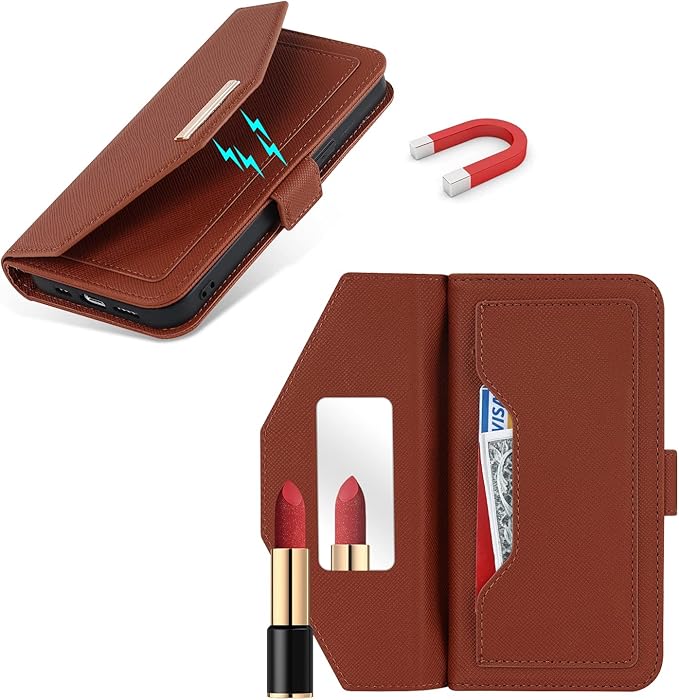 【高級皮革】高品質のPUと柔軟なTPUシェルを組み合わせて、スタイリッシュな外観、快適で滑らかなライン、優れた放熱性と耐衝撃性、優れた耐傷性と防塵性能を備えています. 変形しにくく、取り外しも簡単なので、スマホ自体を傷つける心配もありません。注意:化粧鏡の素材は柔らかい。