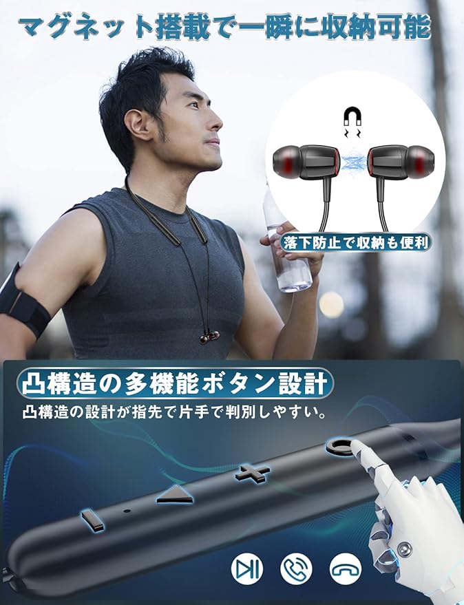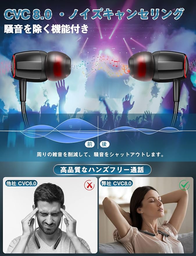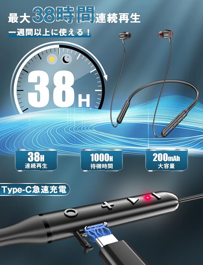 ◆史上最も長い・38時間連続再生ネックバンド型イヤホン登場◆ 【最先端bluetooth5.3チップ・大容量バッテリー】?最先端のBluetooth5.3技術を採用されて、接続性がよく安定して、通信スピード、通信範囲とも向上にしました。従来品と比べると高速で移動する際にも、遠距離の空間にも、従来品より「音飛び」や「音切れ」」などの状況も改善できます。省エネルギーの大容量バッテリーがダブル搭載されているため、1回のフル充電で最大約38時間連続再生できて、普通のbluetoothイヤホンより2倍以上