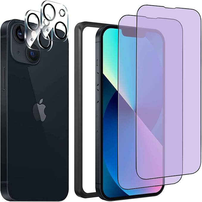 DZHFU iPhone 13 強化ガラスフィルム【4枚入り】 ブルーライトカット 6.1インチ 全面保護フィルム 硬度9H 滑らかなタッチ操作 指紋付着防止 自動吸着 飛散防止 気泡防止 ガイド枠付き 貼り付けは簡単 【強化ガラスフィルム(2枚入り)+レンズ保護フィルム (2枚入り)】
