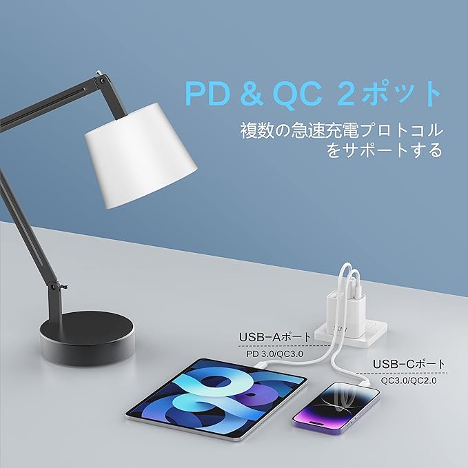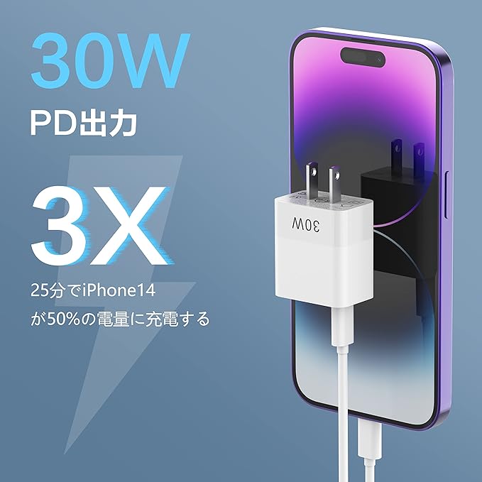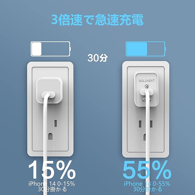 【最大30W USB-C出力・急速充電に最適解】GOLDNEXT USB A&Type C 急速充電器は2最大30Wまで急速充電可能。30W PD 充電器は約30分でiPhone14を50%に充電、通常の充電器より3倍以上になります。PD3.0(USB Power Delivery)、QC3.0(Qualcomm Quick Charge)などの充電規格と互換性があり、スマートフォンやタブレット端末などのデバイス、それぞれの機種に最適かつ急速充電ができます。