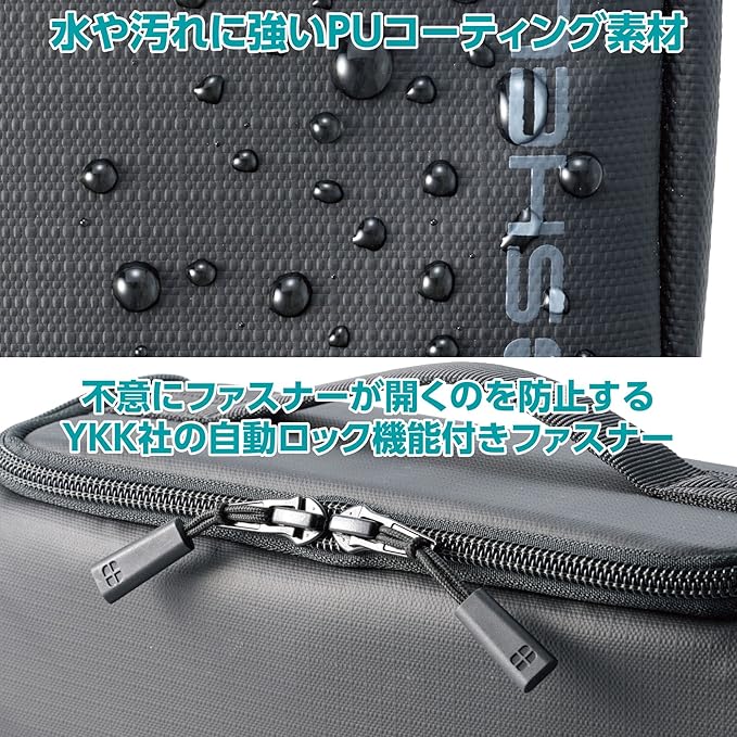 水や汚れに強いPUコーティング素材を採用しています。また不意にファスナーが開くのを防ぐYKK社製の自動ロック機能付きファスナー採用。