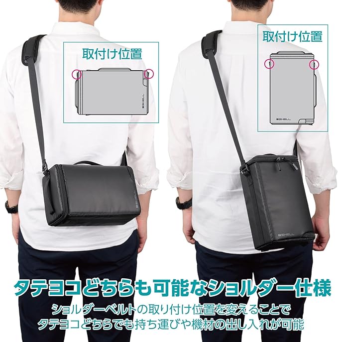 付属のショルダーベルトを装着してショルダーバッグとしても使用ができます。ショルダーベルトの取り付け位置を変えることで、タテヨコどちらでも持ち運びや機材の出し入れができます。