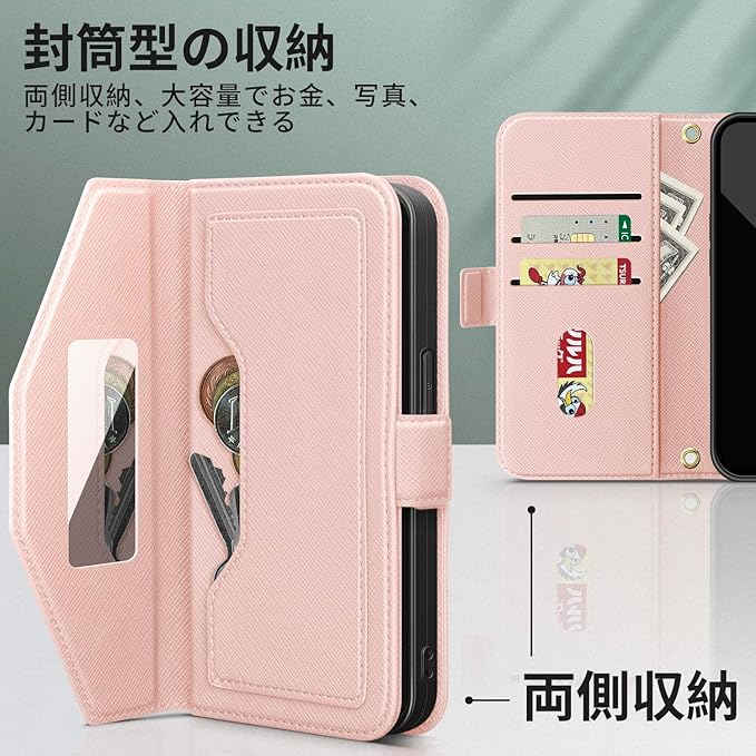 NODALA iPhone X/iPhone XS ケース 手帳型 アイフォンx/xs スマホケース 財布型 ショルダー あいふぉんx/xs 携帯ケース 肩掛け 斜めがけ カバー 手帳型 小銭入れ カード収納 ロングストラップ 長さ調節可能 ミラー付き女性 おしゃれ 横置 ステント機能 折りたたみ 耐衝撃 PUレザー ピンク