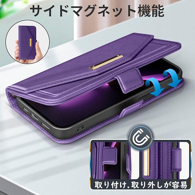 NODALA iPhone 14 ケース 手帳型 アイフォン14 スマホケース 財布型 ショルダー あいふぉん14 携帯ケース 肩掛け 斜めがけ カバー 手帳型 小銭入れ カード収納 ロングストラップ 長さ調節可能 ミラー付き女性 おしゃれ 横置 ステント機能 折りたたみ 耐衝撃 PUレザートパープル