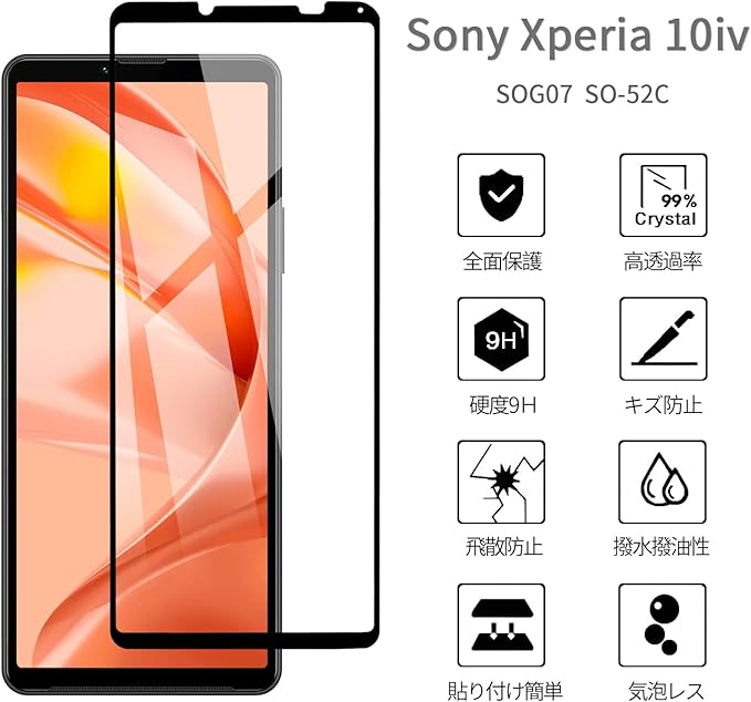 【対応機種】Xperia10IV SOG07 SO-52C(エクスペリア10マーク4 )用。耐衝撃性/気泡防止/指紋付着防止/飛散防止/滑らかなタッチ操作/ 硬度9H強化ガラス/ ご注文前によくお確かめください。