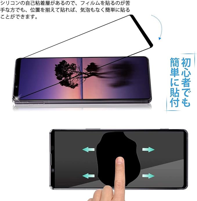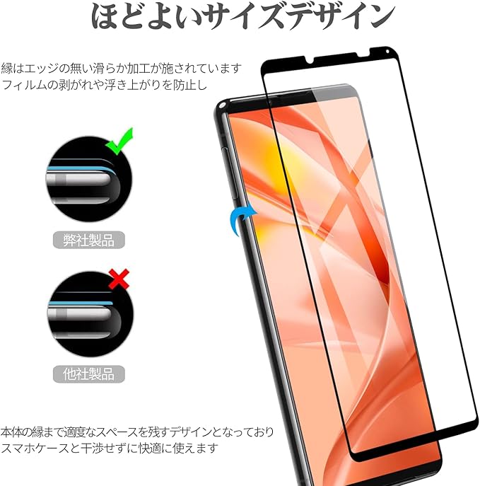 【ほどよいサイズデザイン 、フルカバーデザイン】正確なラウンドエッジ加工により、引っ掛かり感がなくサイドからの衝撃を和らげ気持ち良い滑らかな質感を実現しました。携帯は端部のカーブがフィルム剥がれ、浮きの防止、スマホケース装着スペース確保のため、機器の曲面の縁にスペースを残すデザインとなっています。