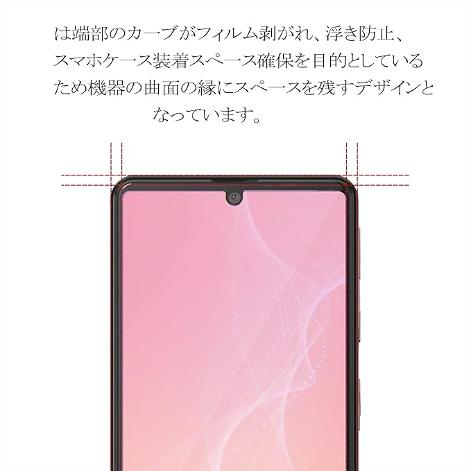 『 対応機種 』AQUOS Sense4 / Sense4 lite / Sense4 basic / Sense5Gに適応しています。携帯は端部のカーブがフィルム剥がれ、浮きの防止、スマホケース装着スペース確保のため、機器の曲面の縁にスペースを残すデザインとなっています。